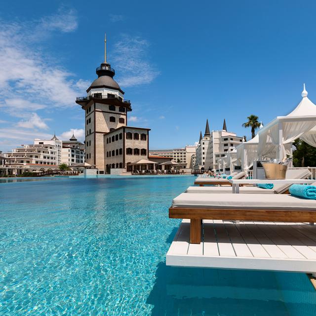 Pal aan de kust van Lara kun je jezelf helemaal onderdompelen in Hotel Mardan Palace. In dit stijlvolle complex met een magische sfeer, waan je je bijna in een modern sprookje. Voor de entree ligt een mooi aangelegde tuin met een grote fontein en ook het klassieke interieur zorgt voor een paleiselijk gevoel, met grote kroonluchters, hoge goudkleurige plafonds en een dik tapijt.