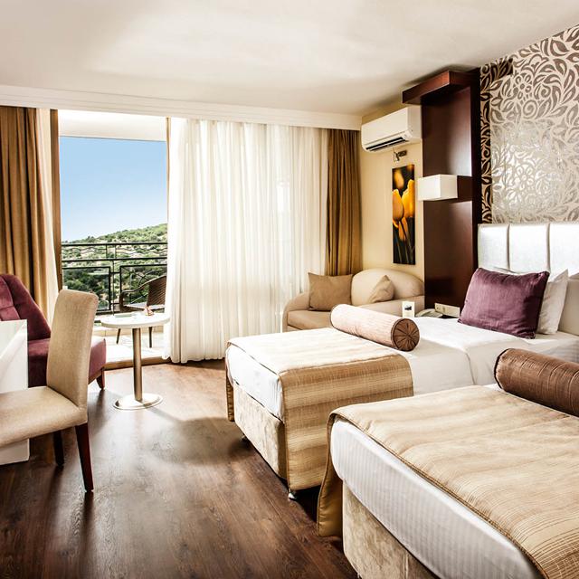 De kamers zijn allemaal modern ingericht en hebben een fijn balkon waar je je even in terug kunt trekken. Vanuit hier heb je een panoramisch uitzicht over de prachtige heuvels die in het oosten liggen of zijaanzicht op de Egeïsche Zee. Omdat je hier op basis van all inclusive verblijft, kan je de hele dag genieten van alle heerlijke lekkernijen die het hotel aanbiedt.